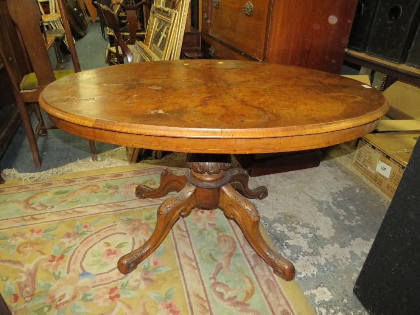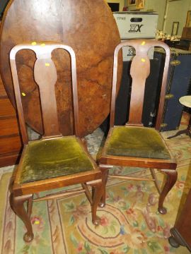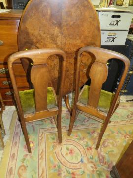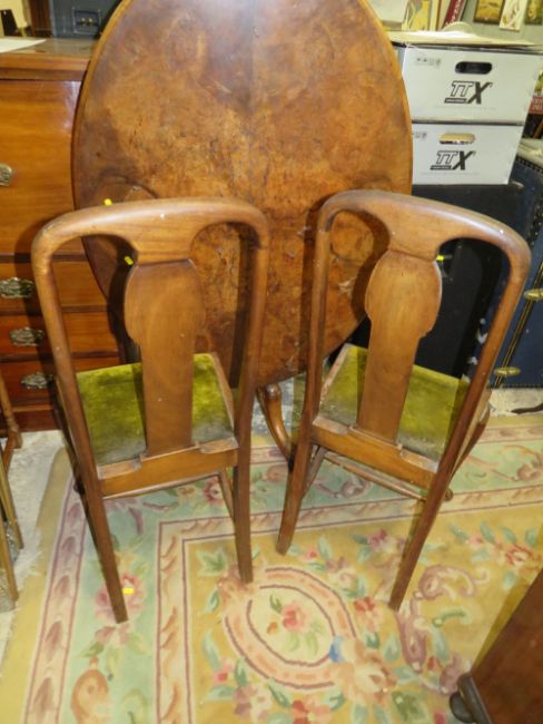 AN ANTIQUE WALNUT / MAHOGANY TILT-TOP TABLE WITH TWO LATER CHAIRS (3)