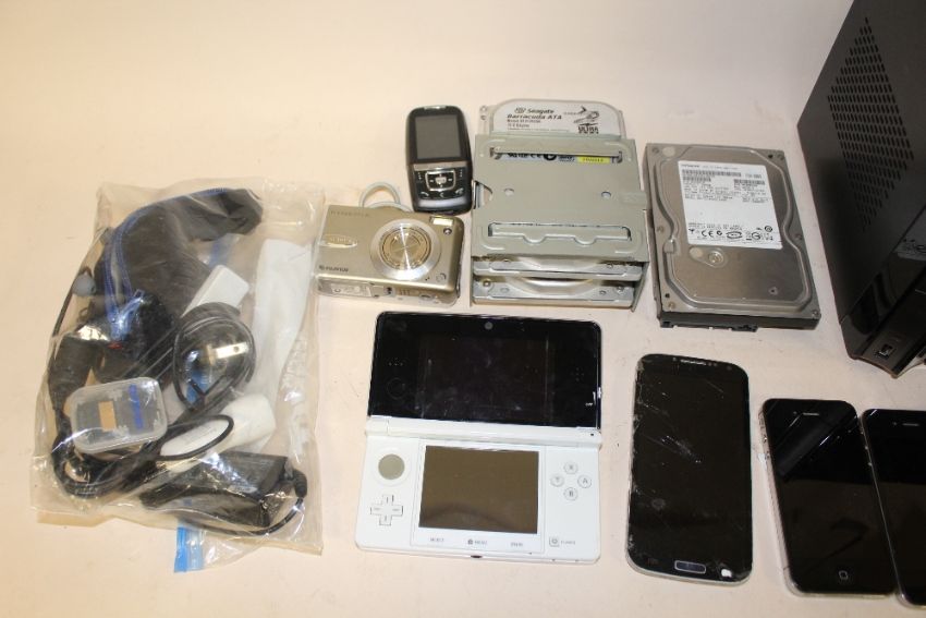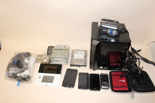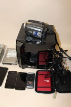 A BOX OF ELECTRICALS TO INCLUDE CAMERAS, IPHONES HARD DRIVES ETC TOGETHER WITH AN ACER HOME SERVER