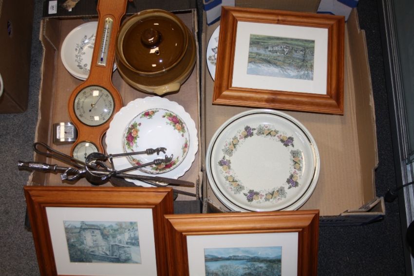 TWO BOXES OF ASSORTED SUNDRIES TO INCLUDE PRINTS, OLD COUNTRY ROSES BOWLS, MODERN WALL BAROMETER ETC.