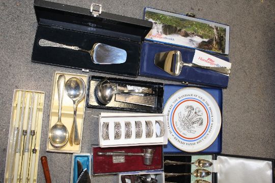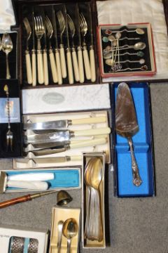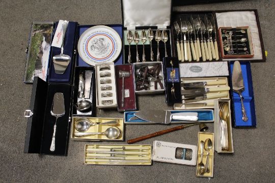 A TRAY OF BOXED CUTLERY TO INCLUDE SILVER PLATED EXAMPLES
