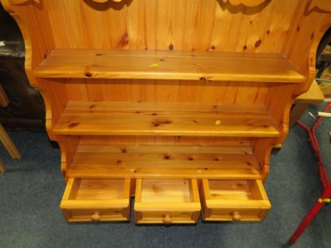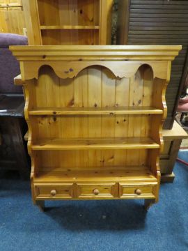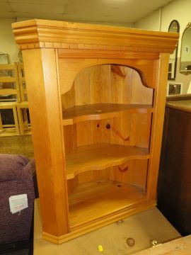 A HONEY PINE HANGING WALL RACK W-85 CM AND A CORNER CABINET (2)
