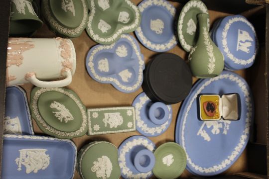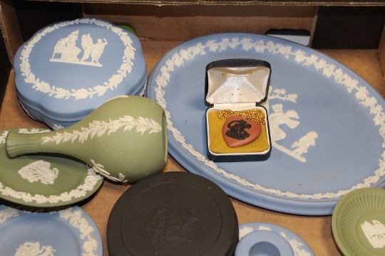 A TRAY OF ASSORTED WEDGWOOD JASPERWARE TO INCLUDE A TERRACOTTA PENDANT ON CHAIN, BLACK BASALT TRINKET BOX ETC.