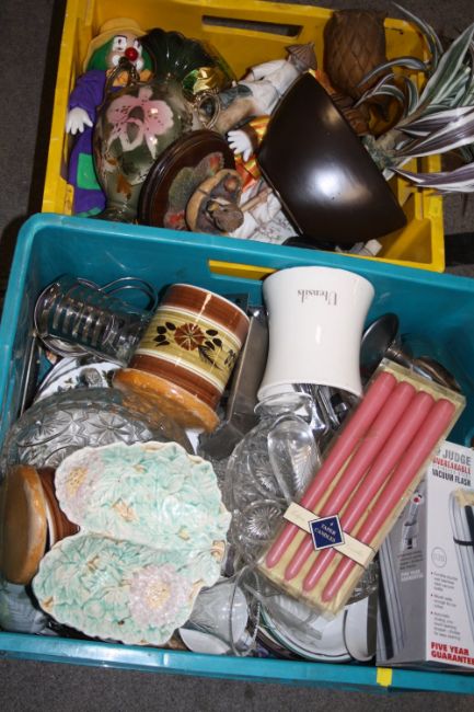FIVE BOXES OF CERAMICS AND SUNDRIES TO INCLUDE CLOWN FIGURES