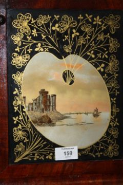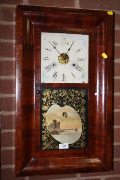 A VINTAGE MAHOGANY CASED WALL CLOCK WITH HAND PAINTED PANEL, A/F, H 66 X W 39 CM