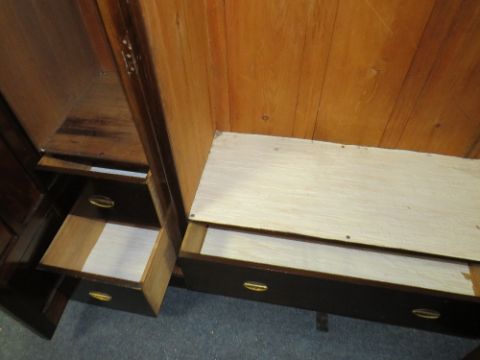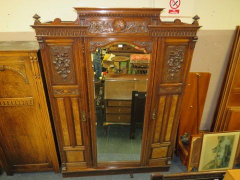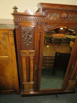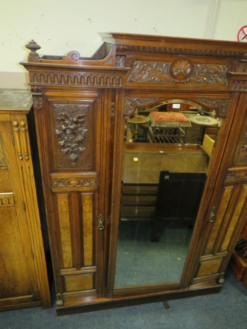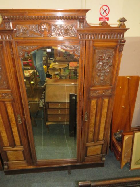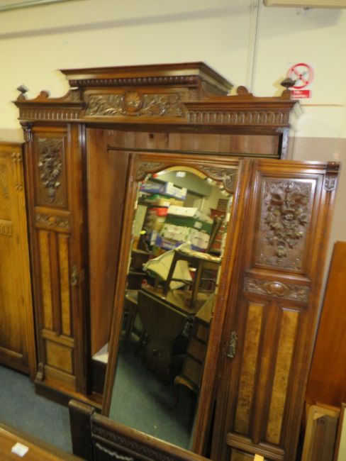 A LARGE EDWARDIAN MAHOGANY / WALNUT MIRRORED ARMOIRE STYLE WARDROBE H-218 W-159 CM TOGETHER WITH AN EDWARDIAN MAHOGANY / WALNUT DRESSING TABLE