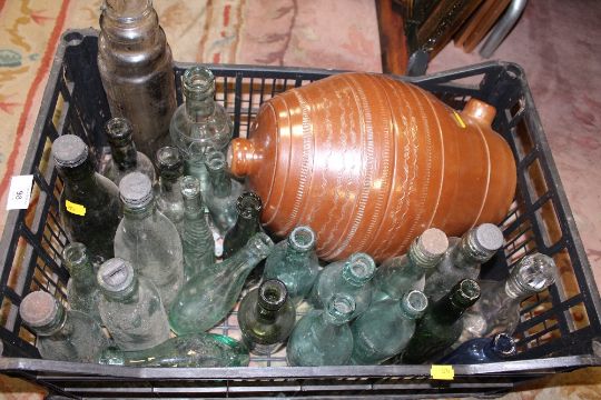 A COLLECTION OF VINTAGE GLASS BOTTLES TOGETHER WITH A STONEWARE BARREL