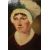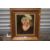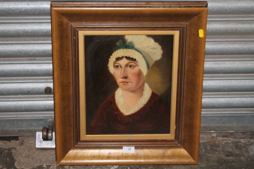 AN ANTIQUE OIL ON BOARD PORTRAIT STUDY OF A LADY IN A BONNET IN A MODERN GILT FRAME - 28 CM BY 34 CM