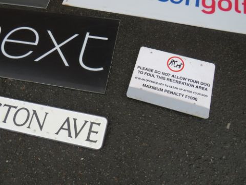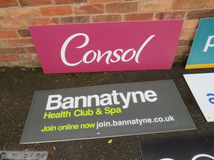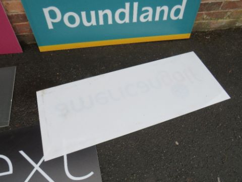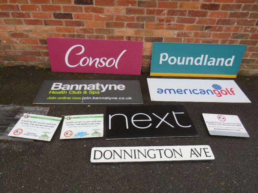 A SELECTION OF ACRYLIC SHOP RETAIL SIGNS to include Greggs, Next, American Golf, W 124 cm TOGETHER WITH A STREET SIGN, ETC