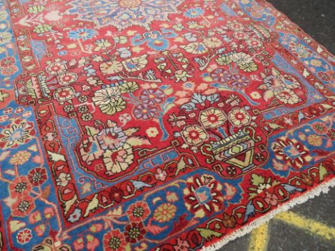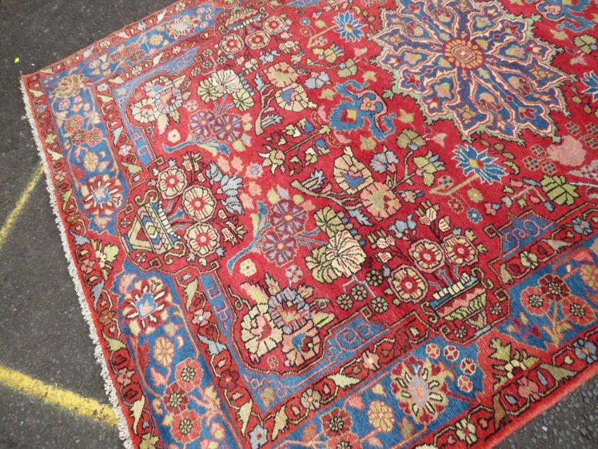 AN EASTERN WOOLLEN RUG MAINLY RED / PINK GROUND 235 X 156 CM