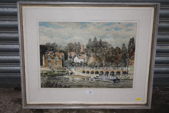 A FRAMED AND GLAZED WATERCOLOUR ENTITLED ARLEY FERRY (WORCS) SIGNED R W DICKENS LOWER CENTRE - 50.5 CM BY 36.5 CM