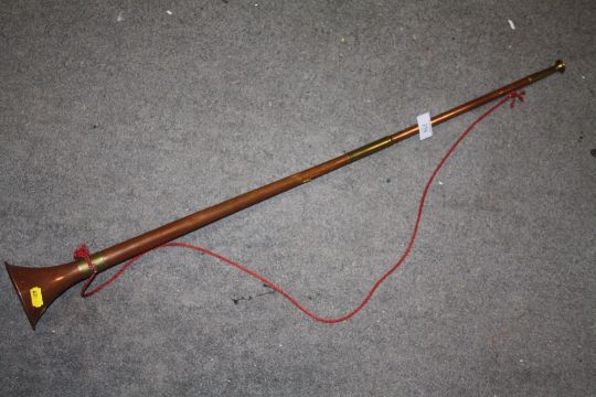 A VINTAGE COPPER AND BRASS HUNTING HORN LENGTH - 89CM