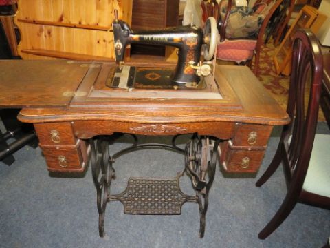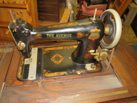 A VINTAGE OAK TREADLE SEWING MACHINE WITH 'THE AVENUE' AMERICAN MADE MACHINE