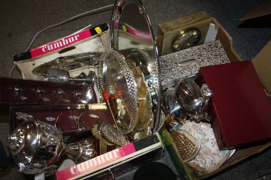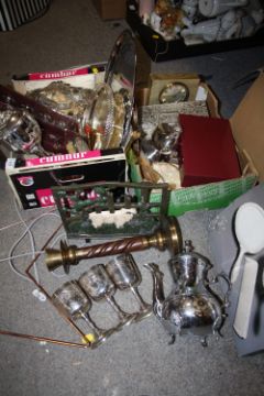 TWO BOXES OF ASSORTED METALWARE TO INCLUDE A CAST METAL MUSIC STAND, MODERN STAR SHAPED WALL LIGHT, SILVER PLATED WARE ETC.