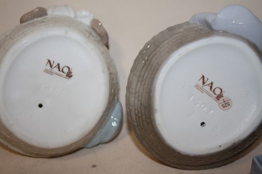 THREE NAO FIGURES OF RABBITS, A CAT AND A DOG IN BASKETS