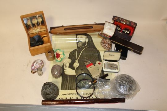 A BOX OF COLLECTABLES TO INCLUDE A LOOM SHUTTLE, MUSICAL BOX, CUFFLINKS ETC