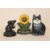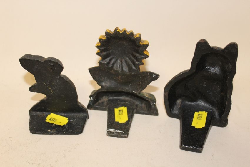 THREE SMALL CAST METAL DOOR STOPS IN THE FORM OF A CAT, MOUSE AND SUN FLOWER