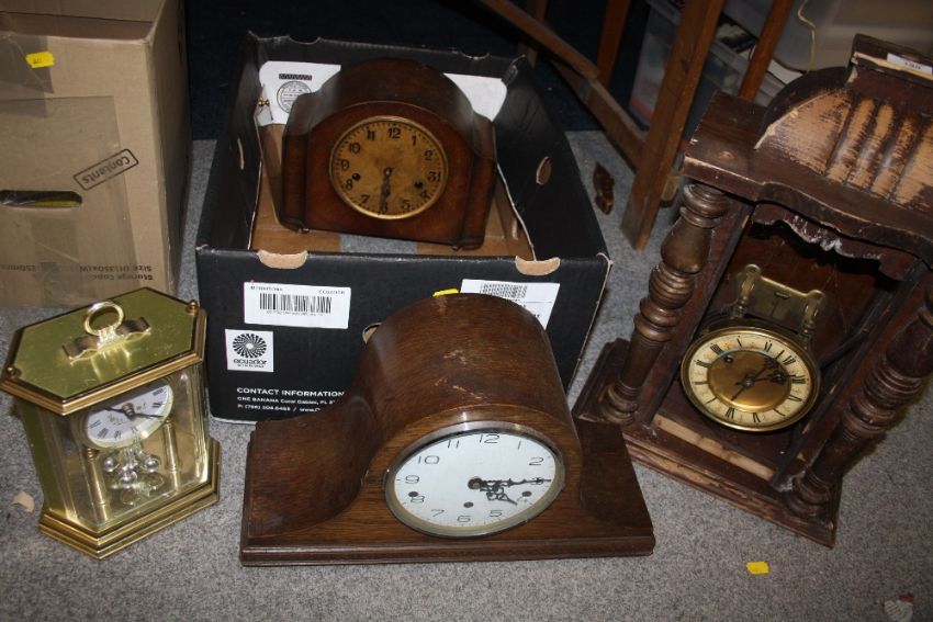A COLLECTION OF MANTEL CLOCKS TO INCLUDE OAK CASED EXAMPLES A/F