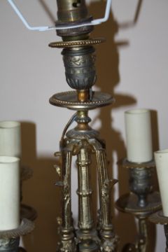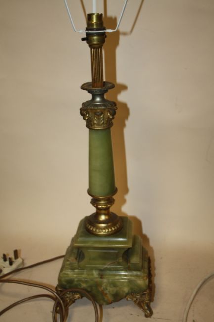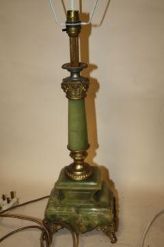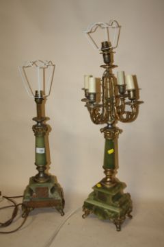 TWO ONYX AND BRASS EFFECT VINTAGE TABLE LAMPS TO INCLUDE A FIVE BRANCH EXAMPLE - TALLEST 72CM - SMALLER 53CM WITH SHADES