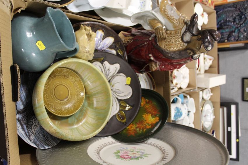 A TRAY OF ASSORTED CERAMICS TO INCLUDE AN ORIENTAL FIGURE A/F, RUSKIN STYLE BOWL ETC.