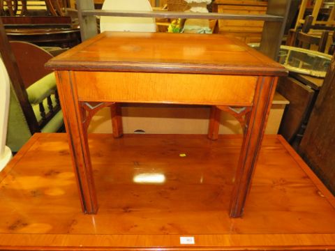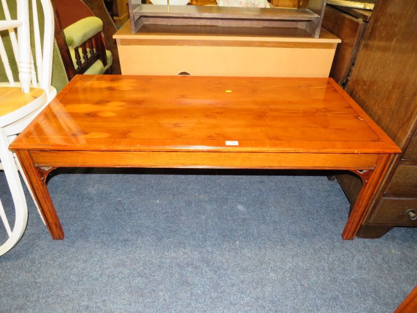 A YEW WOOD RECTANGULAR COFFEE TABLE W-122 CM WITH THREE OCCASIONAL TABLES (4)