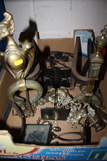 A TRAY OF METAL WARE TO INCLUDE FIREDOGS, HORSE BRASSES ETC