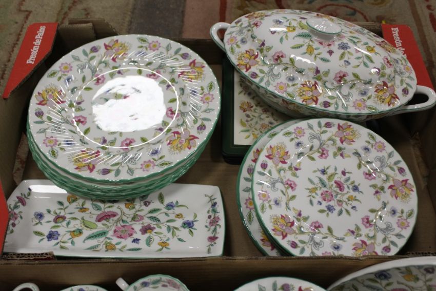 TWO TRAYS OF MINTON HADDON HALL CHINA TO INCLUDE TUREENS, TEA POT ETC.