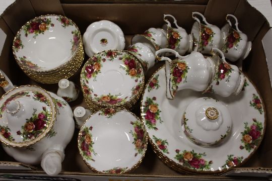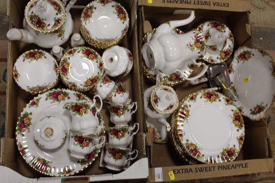 TWO TRAYS OF ROYAL ALBERT OLD COUNTRY ROSES CHINA TO INCLUDE TEA AND COFFEE POTS, DINING PLATES ETC.
