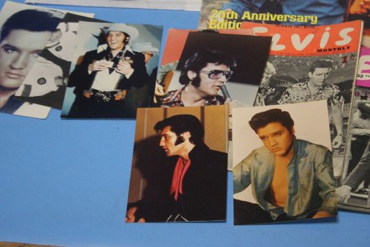 A BOX OF ELVIS MEMORABILIA TO INCLUDE FACSIMILE MAGAZINES, PHOTOGRAPHS ETC.