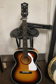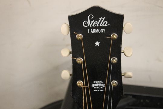A STELLA ACOUSTIC GUITAR TOGETHER WITH A STOOL