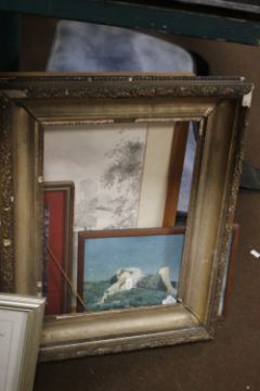 A QUANTITY OF PICTURES, PRINTS AND A GILT FRAME A/F