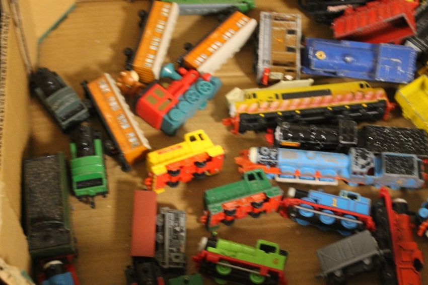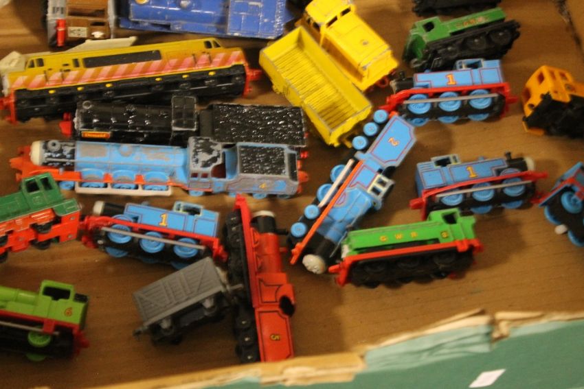 A COLLECTION OF MODEL TRAINS AND CARRIAGES TO INCLUDE 'THOMAS THE TANK ENGINE' TYPE TOGETHER WITH A TRAY OF ASSORTED ITEMS TO INCLUDE A CHESS SET, A JUGGLING CLUB, ETC. (TRAY NOT INCLUDED)