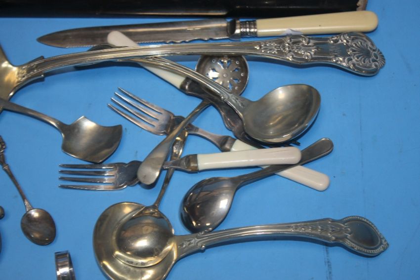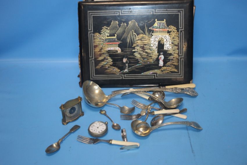 AN ORIENTAL STYLE POSTCARD / PHOTOGRAPH ALBUM TOGETHER WITH A COLLECTION OF WHITE METAL FLATWARE POCKET WATCH AND A SMALL MANTEL CLOCK