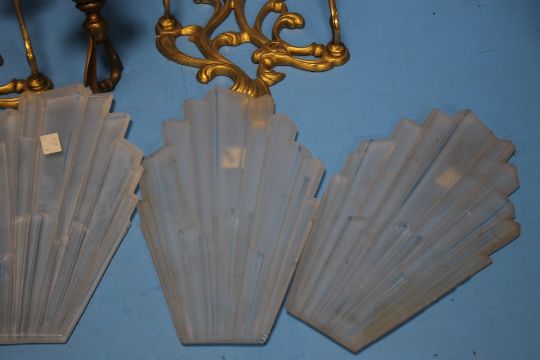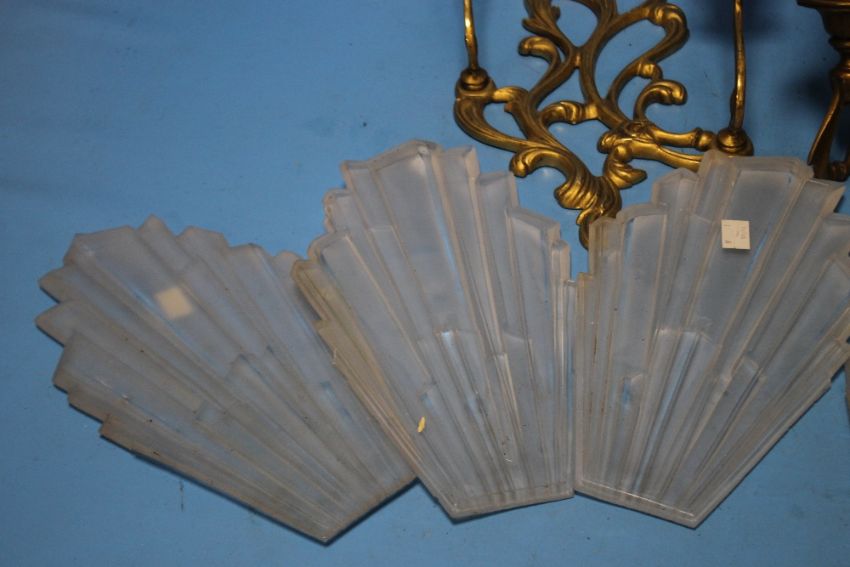 A VINTAGE HANGING CEILING LIGHT WITH FIVE ART DECO STYLE OPAQUE GLASS PANELS, TOGETHER WITH A PAIR OF WALL MOUNTED BRASS CANDLE HOLDERS Condition Report: The glass panels appear to be correct but there are two brass stems missing that hold them in place