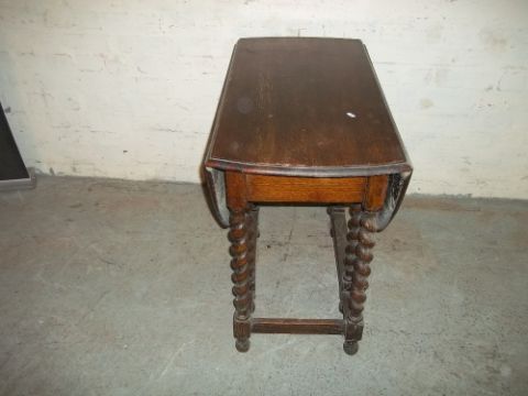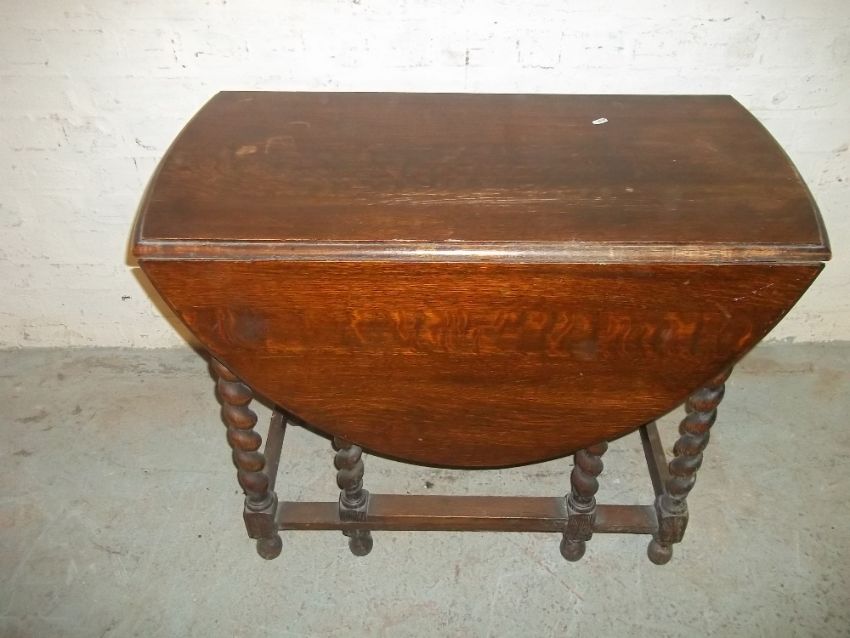 AN OAK DROP LEAF TABLE WITH BARLEY TWIST LEGS, H 72 cm, W 90 cm, L with leaves up 121 cm, with leaves down 46 cm