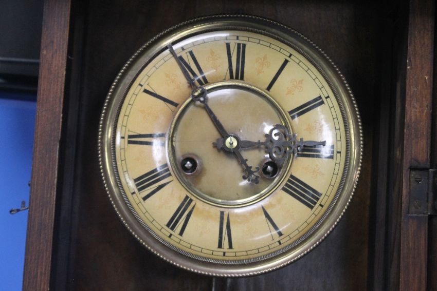 A HANGING WALL CLOCK A/F WITH KEY AND PENDULUM