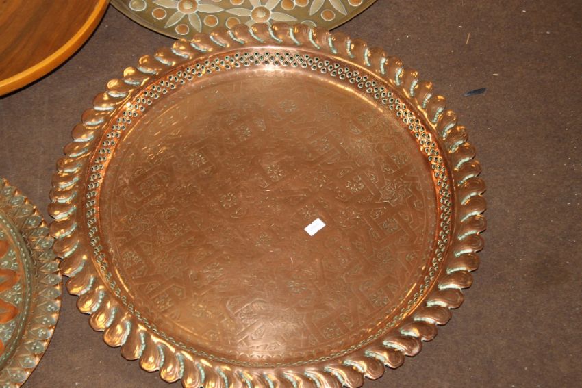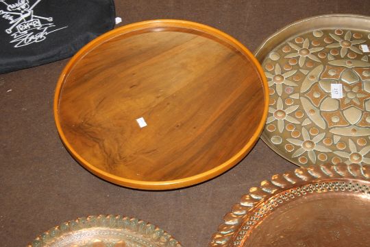 FOUR CHARGERS TO INCLUDE A WOODEN "LAZY SUSAN", COPPER AND BRASS