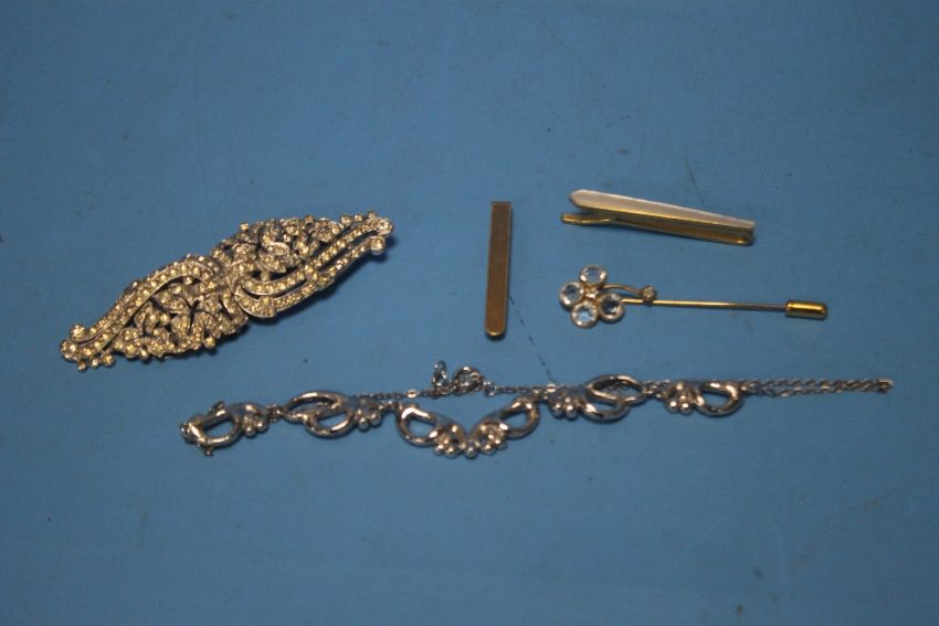 TWO YELLOW METAL TIE CLIPS, HAT PIN, WHITE METAL BROOCH ETC.