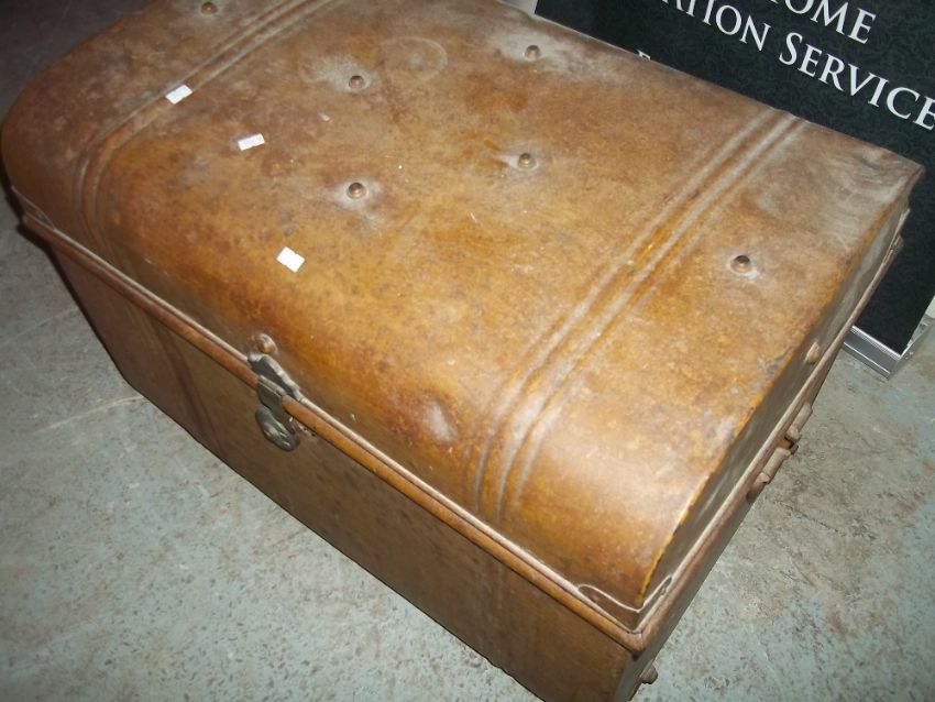 A LARGE METAL TRAVEL TRUNK
