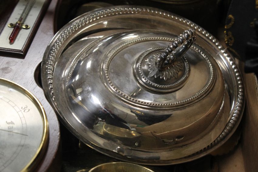 A TRAY OF METALWARE ETC. TO INCLUDE A BAROMETER
