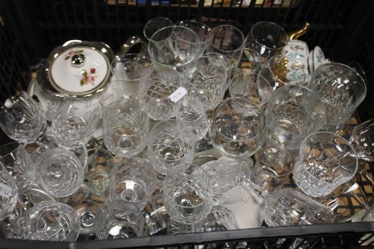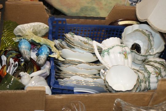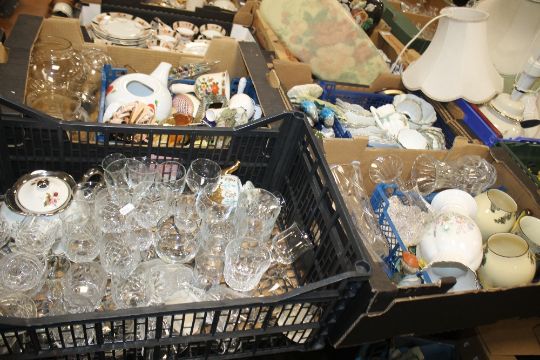 FOUR TRAYS OF CERAMICS AND GLASSWARE TO INCLUDE AN AYNSLEY VASE, PARAGON TEA & DINNERWARE ETC.