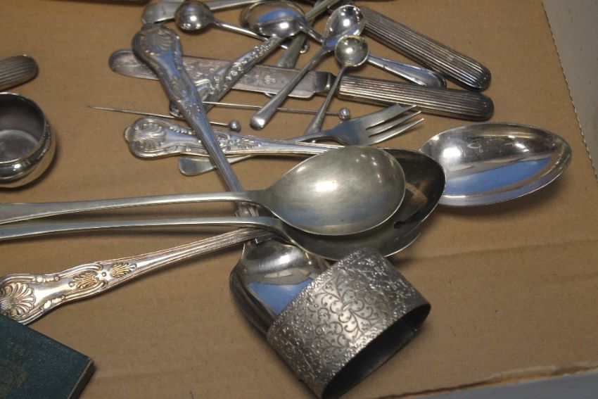 A QUANTITY OF WHITE METAL FLATWARE, COINS ETC.