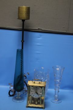 A HEAVY CUT GLASS VASE, A TALL TWISTED STEM VASE AND A TALL BLUE GLASS VASE together with A KOMA MANTEL CLOCK AND A TRIPOD CAST IRON CANDLE STAND WITH CANDLE