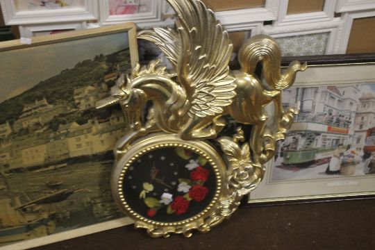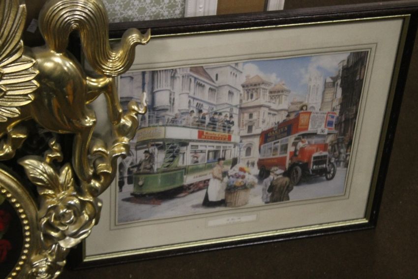 TWO PICTURE FRAMES TOGETHER WITH TWO PRINTS, A MIRROR AND A MODERN CLOCK