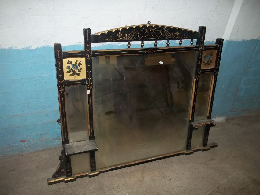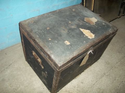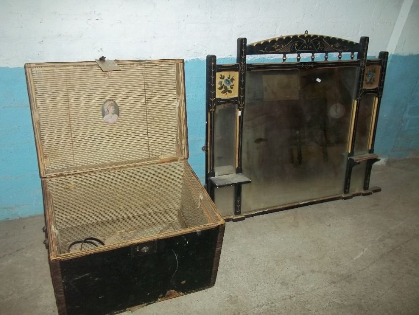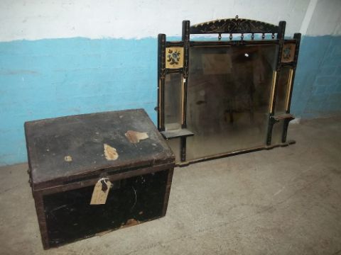 AN ANTIQUE OVER MANTEL MIRROR AND A WOODEN TRAVEL TRUNK