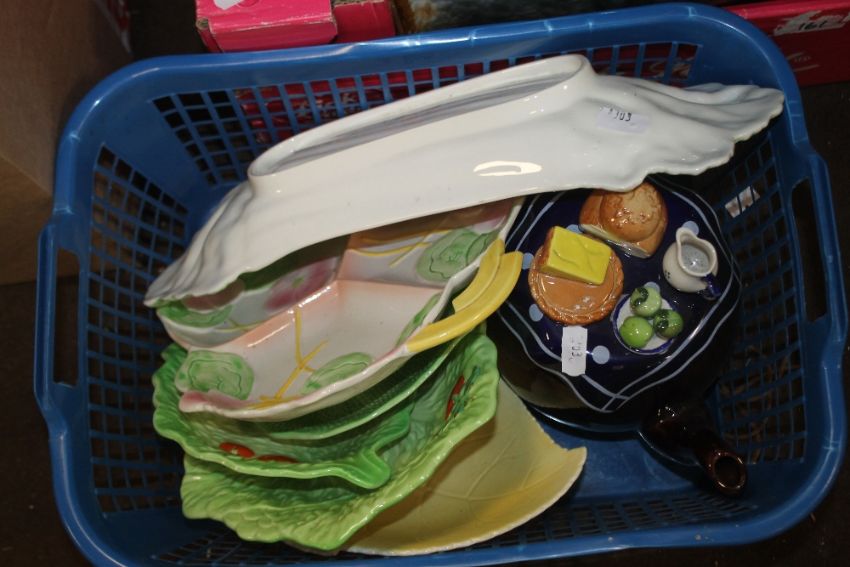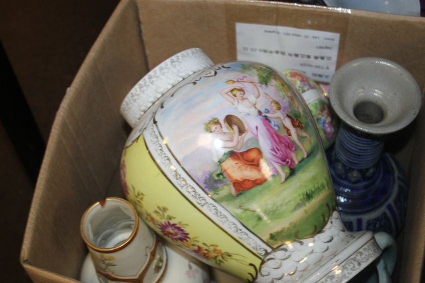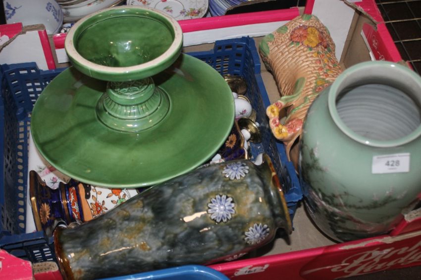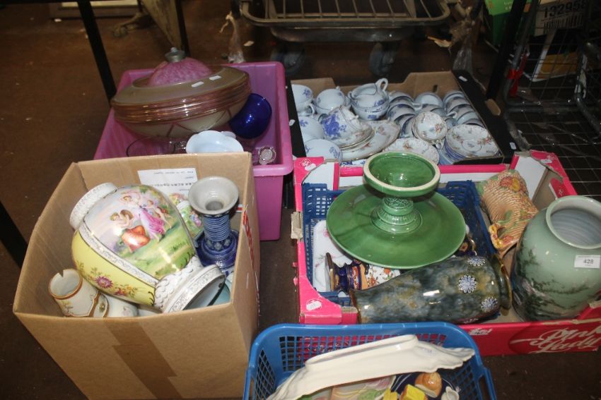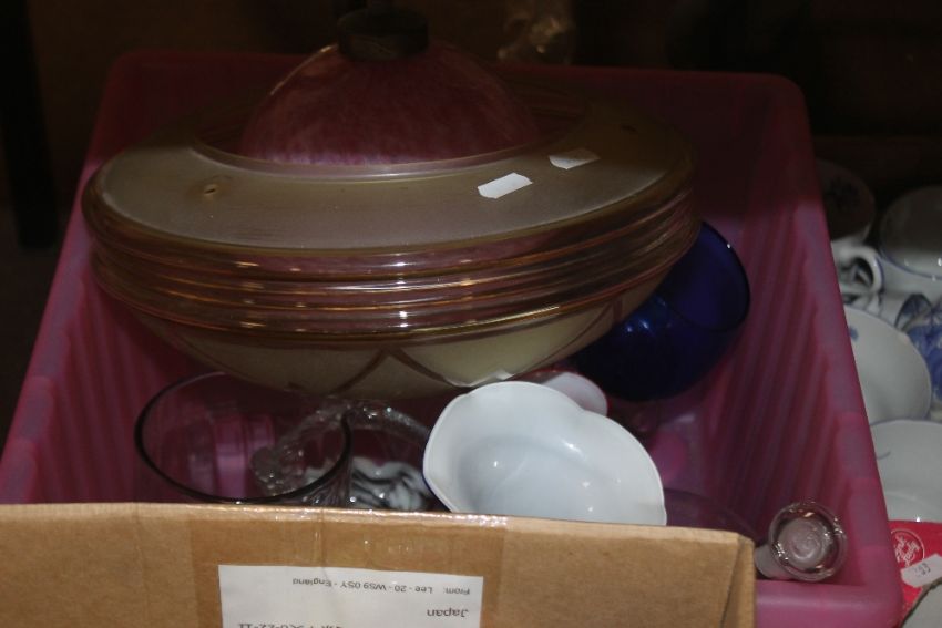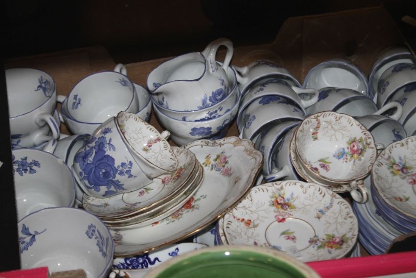 THREE TRAYS OF POTTERY TO INCLUDE COLOURED GLASS VASES, PART SPODE AND COALPORT TEASETS ETC. (TRAYS NOT INCLUDED)