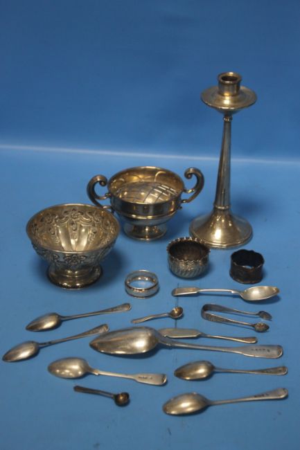 A COLLECTION OF HALLMARKED SILVER AND WHITE METAL ITEMS TO INCLUDE CANDLE HOLDER, TEASPOONS, ROSE BOWL ETC.