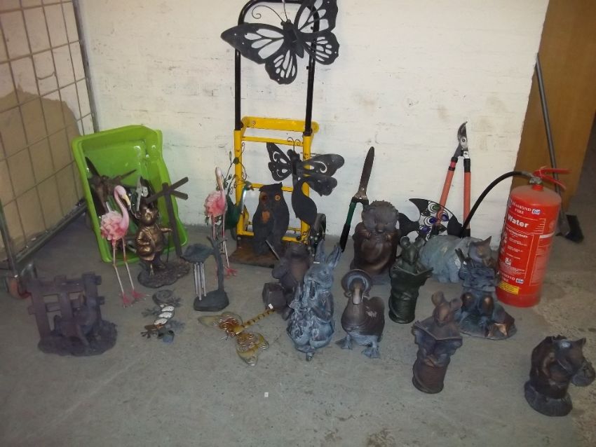 A QUANTITY OF GARDEN ORNAMENTS IN PLASTIC AND AND WALL ART PIECES INCLUDING BEATRIX POTTER THEMED ITEMS