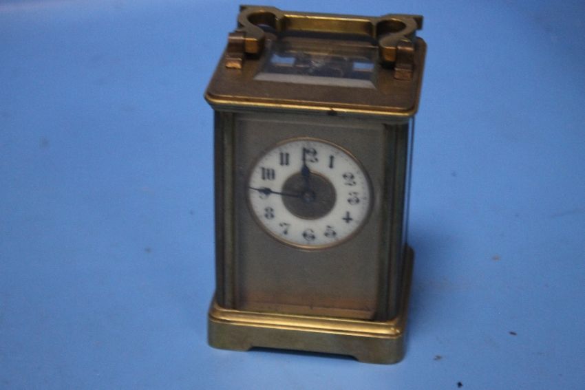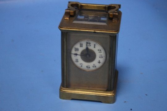 A VINTAGE BRASS CARRIAGE CLOCK IN ORIGINAL CASE, "R & CO" STAMPED TO BACK, H 11 cm, W 7.5 cm, D 7 cm