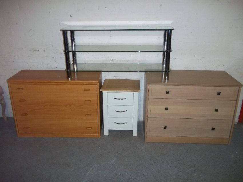 THREE MODERN CHESTS OF DRAWERS AND A GLASS TV STAND