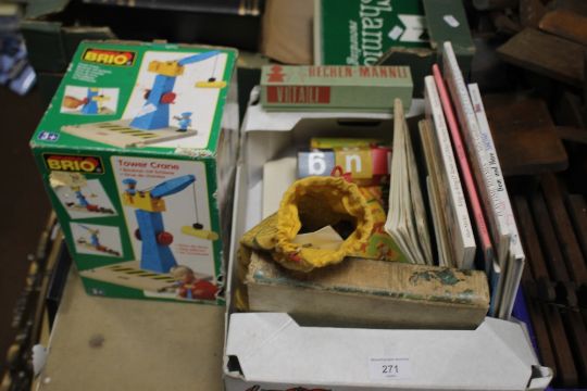 A TRAY OF CHILDREN'S TOYS AND BOOKS TO INCLUDE A BRIO TOWER CRANE, CUISENNAIRE RODS ETC.